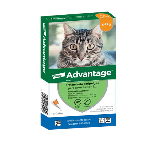 Advantage® Gatos es un pulguicida desarrollado exclusivamente por Bayer, de acción tópica, indicado en el tratamiento y control de infestaciones de pulgas (Ctenocephalides spp.) en gatos. Después de la aplicación, la grasa natural del pelaje y los movimientos del animal distribuyen la dosis sobre toda la superficie corporal, eliminando el 100% de las pulgas durante las primeras 12 horas.