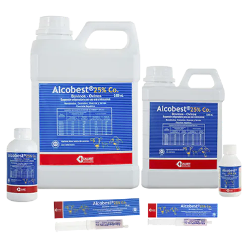 Para el control de parásitos gastrointestinales y pulmonares en general y de tenias: 5mg/kg de peso vivo, 1mL de Alcobest®25% Co. por cada 50kg de peso vivo.