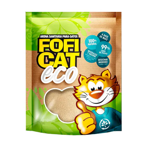 Arena Sanitaria Fofi Cat Eco Producto altamente absorbente, al contacto con heces y/o orina de gatos elimina el mal olor y la humedad. 100% Natural y 99% libre de polvo