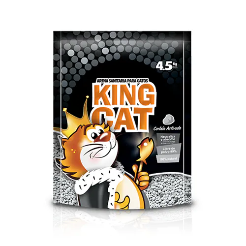 Arena Sanitaria King Cat Carbón Activado Arena super aglomerante de fina granulación, 0% de humedad, 100% natural y libre de polvo en un 99%. Neutraliza y absorbe rápidamente los olores de las heces y la orina de los gatos con su esencia a carbón activado y controla la humedad de las mismas.