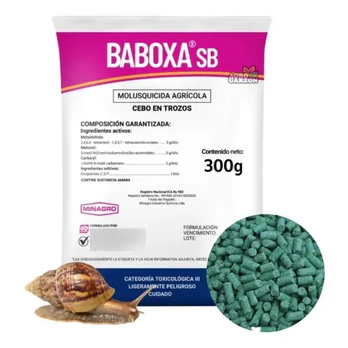 Baboxa® es un cebo molusquicida de triple acción, diseñado para controlar babosas y caracoles por ingestión y contacto. Su formulación permite el control eficiente de la plaga aún en condiciones adversas de humedad y luz solar. Baboxa® puede ser aplicado de forma preventiva, antes de la lluvia o como tratamiento para controlar grandes infestaciones de moluscos.