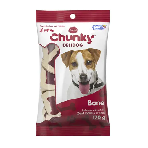 Se trata de un snack 2 en 1, cuenta con dos formas en el mismo paquete, una alargada en forma de hueso (BONE) y otras figuras pequeñas en forma de ( T- BONE) con hígado y sabor a tocineta.