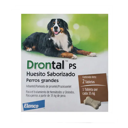 Drontal® PS Saborizado Perros Grandes es un endoparasiticida de amplio espectro especialmente diseñado para perros con peso de hasta 35 kg, que actúa contra las formas maduras e inmaduras de los siguientes nemátodos, céstodos y protozoarios en perros: Nemátodos: Toxocara canis, Toxascaris leonina, Uncinaria stenocephla, Ancylostoma caninum, Ancyslostoma braziliense, Trichuris vulpis. Céstodos: Echinococcus granulosus, Echinococcus multilocularis, Dipylidium caninum, Taenia hydatigena, Taenia pisiformis, Multiceps multiceps, Joyeuxiella pasqualei, Mesocestoides spp. Protozoarios: Giardia spp; para el tratamiento de Giardia, utilizar por 3 días seguidos.