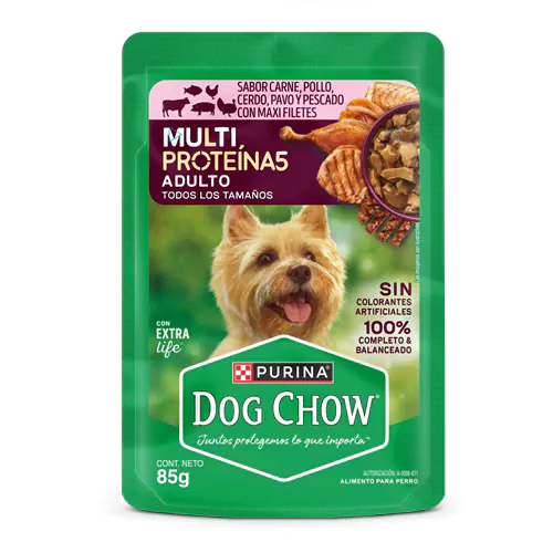de subproductos de pollo, arroz, carne vacuna (res) congelada, sal*, carbonato de calcio, cloruro de potasio, fosfato bicálcico y/o zeolita, colorante caramelo