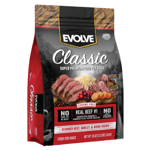 EVOLVE DOG CLASSIC BEEF – CARNE está fabricado para perros que prefieren el sabor de la carne, tienen o manejo de alergias por proteína de pollo. Tiene todos los nutrientes necesarios para una feliz y saludable vida. Evoluciona es rico en nutrientes y contiene proteínas de alta calidad, carbohidratos complejos, vegetales, minerales, vitaminas, aceites y grasas. Porque nos preocupamos por la calidad de nuestra comida, elegimos por hacer la carne de res real y fresca, el ingrediente número 1, que apela a los instintos ancestrales naturales de los perros. Nosotros queremos los mejores ingredientes naturales para nuestros mejores amigos. Puede estar seguro de alimentar a su perro con Evolve, nutrición super premium natural, saludable y con un delicioso sabor.