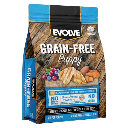 EVOLVE GRAIN FREE PUPPY es un alimento que no incorpora cereales en su dieta con un alto estándar de nutrición Esta fabricado para las necesidades especiales de energía de los cachorros en crecimiento, usando el pollo real y fresco como primer ingrediente. Evolve Puppy promueve el desarrollo de músculos y huesos fuertes y un pelo sano. Evoluciona es rico en nutrientes y contiene proteínas de alta calidad, carbohidratos complejos, vegetales, minerales, vitaminas, aceites y grasas. Porque nos preocupamos por la calidad de nuestra comida, elegimos por hacer pollo real y fresco, el ingrediente número 1, que apela a los instintos ancestrales naturales de los perros .. Al elegir Evolve Puppy, usted está eligiendo un futuro brillante, fuerte y saludable para su cachorro. Pronto, usted comenzará a ver a su mejor amigo florecer y prosperar frente a sus ojos. Puede estar seguro de alimentar a su perro con Evolve, nutricion super premium natural, saludable y con un delicioso sabor !!