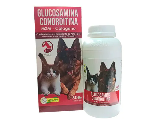 Cada tableta contiene 600 mg de Glucosamina HCl y 500 mg de Condroitina Sulfato, complementados con Metilsulfonilmetano (MSM) y Colágeno Hidrolizado. Estos ingredientes trabajan en sinergia para fortalecer y proteger las articulaciones, brindando un efecto positivo en su calidad de vida, especialmente en etapas de mayor actividad o en animales de edad avanzada.
