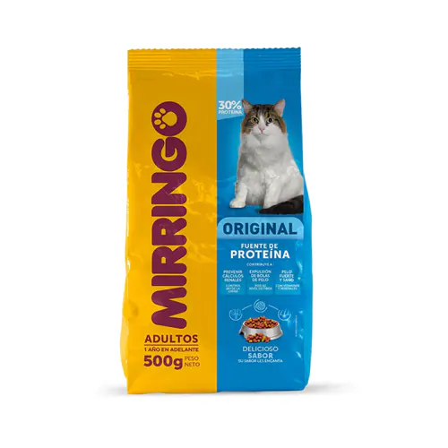 MIRRINGO es un alimento completo que satisface todos los requerimientos nutricionales de crecimiento, desarrollo, mantenimiento y lactancia para gatos de todas las razas. Sus ingredientes incluyen 30% de proteína de pollo, carne o pescado, que son una gran fuente de alimento para tu mirringo.