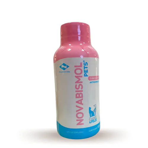NOVABISMOL actúa como protector de la mucosa intestinal disminuyendo la irritación y adsorbe las toxinas presentes en el tracto gastrointestinal de BOVINOS, EQUINOS, PERROS y GATOS.